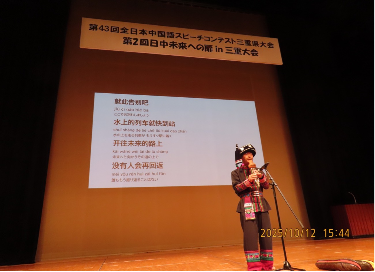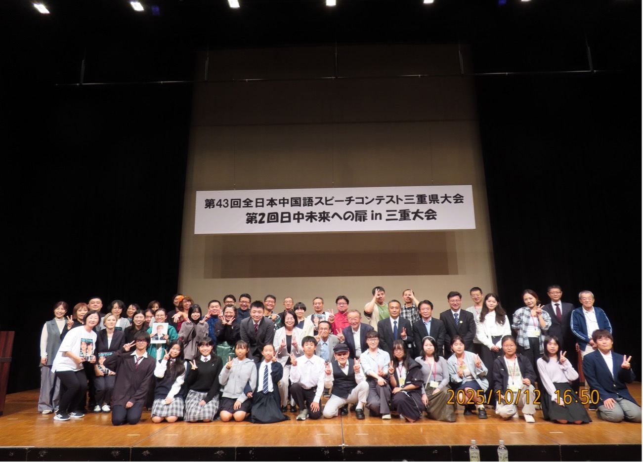 2025年10月12日(日)に、NPO法人三重県日本中国友好協会主催、情報システム・J・T(株)・中国食彩渓泉・小米技術日本(株)協賛、中華人民共和国駐名古屋総領事館・三重県・津市・(公)三重県国際交流財団・津市国際交流協会後援による「第43回全日本中国語スピーチコンテスト三重県大会・第2回日中未来への扉in 三重大会」が、三重県総合文化センター小ホールで開催され、朴 恵淑NPO法人三重県日中友好協会副会長・「三重GPN」代表幹事(会長)・三重大学地域イノベーション学研究科客員教授が参加し、開催挨拶を行いました。