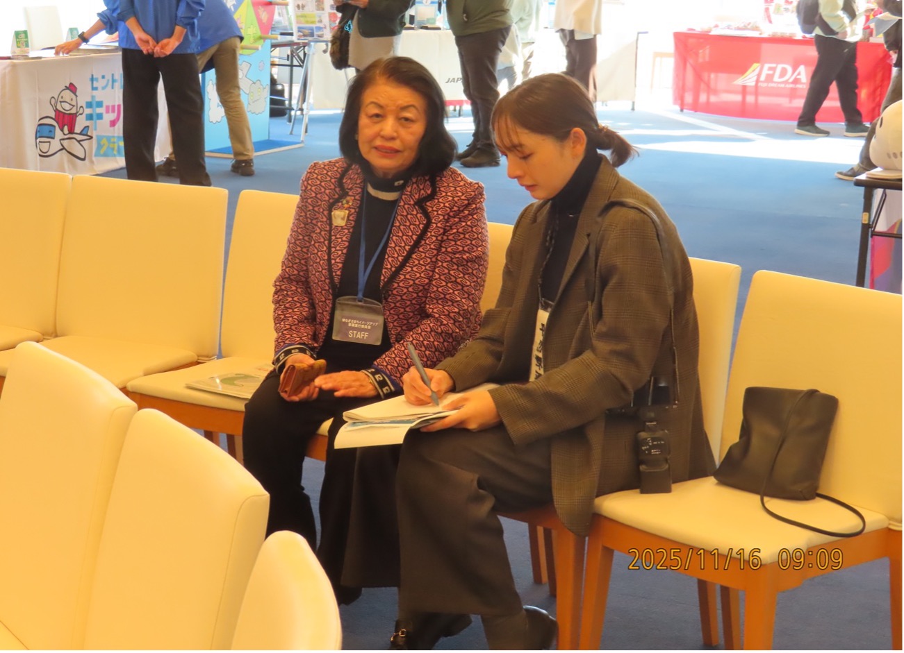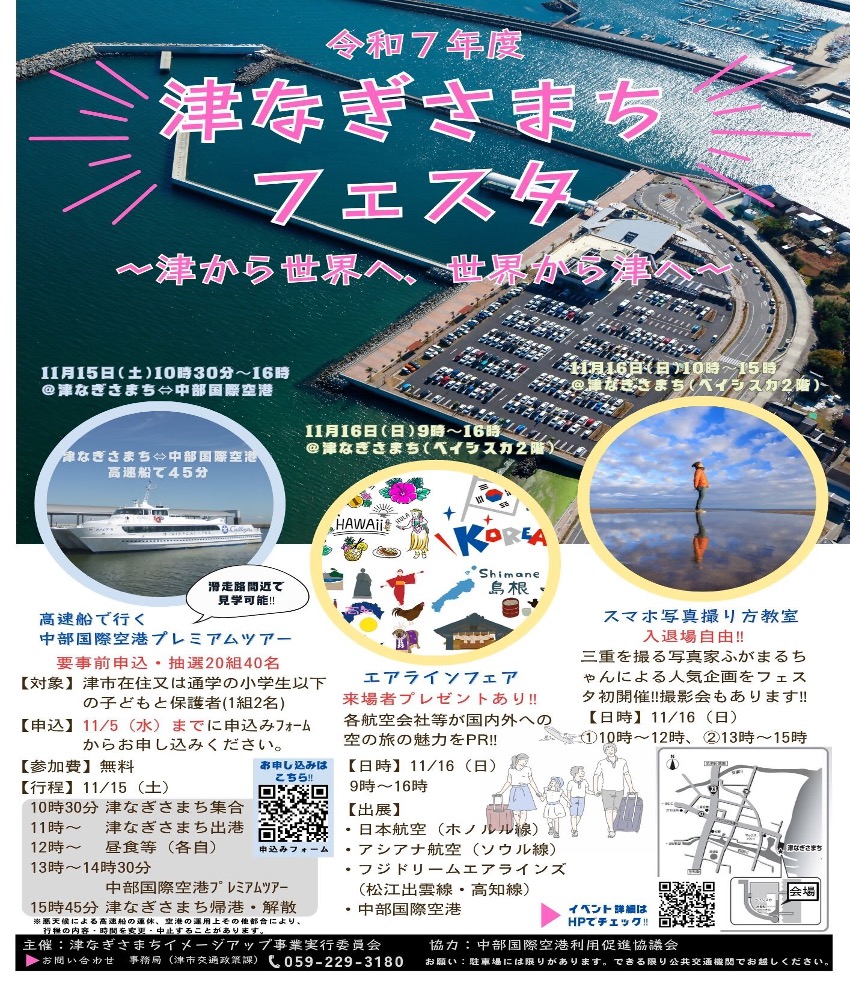 翌日の2025年11月16日(日)は、津なぎさまちにおいて、エアラインフェアが開催され、日本航空、アシアナ航空、フジドリームエアラインズ、中部国際空港のブースでの空の旅に関する学びおよびパイロット、キャビンアテンダントの協力によるユニフォームの着用体験などが行われました。また、おぼろタオル(株)の展示と販売、さらに、写真家のふがまるちゃんによる、スマホ写真撮り方教室が開催され、風景写真撮影や人物写真撮影が行われました。