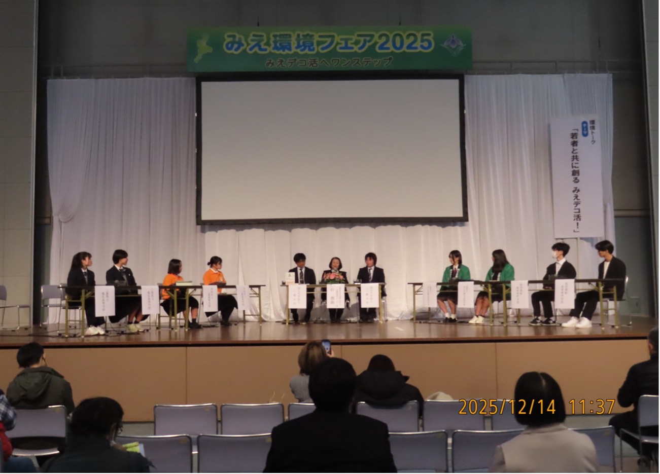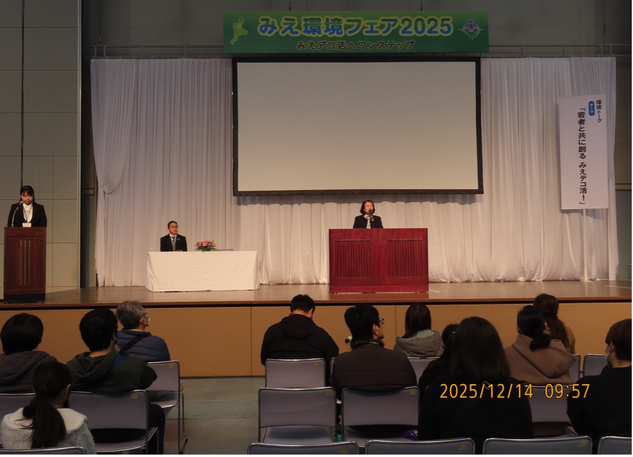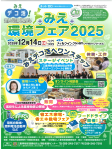 2025年12月14日(日)に、メッセウィングNHWで開催された三重県最大の環境フェアの「みえ環境フェア2025」に「三重GPN/三重大学ESD-SDGsクラブ」のブース展示およびステージイベント環境トーク「若者と共に創るみえデコ活!」に参加しました。