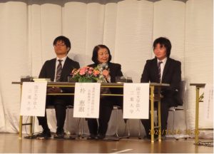 続いて、鳥羽商船高等専門学校の牡蠣養殖と植物プランクトンの識別システムの開発と海苔養殖のカモ食害対策システムについての発表、三重高等学校の伊勢湾最大級の干潟の松名瀬干潟での生物多様性学習の発表、桑名高校学校のSSH校としての取り組みの植物から創るマーカーで描く環境に配慮した未来像の発表、四日市農芸高等学校の竹粉を用いたエコフィードの発表が行われました。発表後の懇談において、これまでの成果と課題を整理し、書籍出版を行うこととなりました。持続可能な社会三重創生において、高校生、高等専門学校の学生、大学生が一緒になって、書籍出版を行うことへの期待に、聴衆から励ましの大きな拍手が送られました。