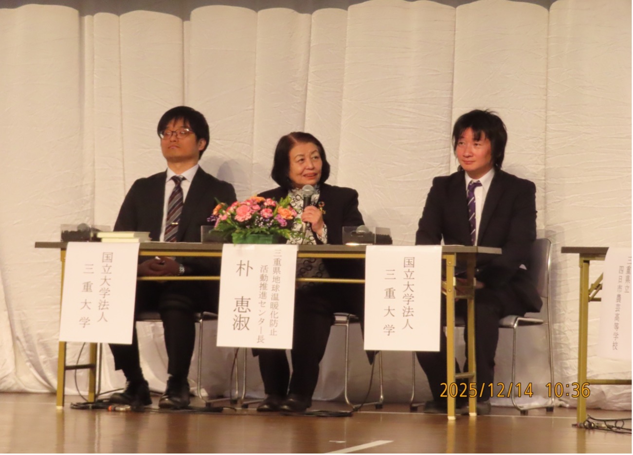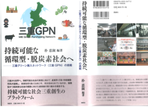 また、朴 恵淑三重県地球温暖化防止活動推進センター長/三重大学地域イノベーション学研究科客員教授/「三重GPN」代表幹事がコーディネーターをつとめる、ステージイベントの「若者と共に創るみえデコ活!」をテーマに行われた環境トークに、「三重GPN」の事務局を担っている小西 凌三重大学非常勤講師/安部大樹三重大学特任助教・三重大学地域イノベーション学研究科博士課程が登壇し、「三重GPN」および三重大学ESD-SDGs活動の発表を行いました。特に、「三重GPN」書籍の「持続可能な循環型・脱炭素社会へ〜三重グリーン購入ネットワーク(GPN)の挑戦;朴 恵淑編著、風媒社」を披露し、活動の成果を書籍にまとめる作業と相乗効果について力強く紹介しました。