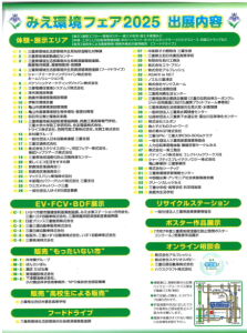 「みえ環境フェア2025」は、三重県地球温暖化防止活動推進センター(事務局;一般財団法人三重県環境保全事業団)主催・三重県共催・中部地方環境事務所/中部経済産業局後援・一般社団法人三重県産業廃棄物協会協賛・三重県気候変動適応センター協力によって開催され、「みえデコ活へワンステップ」をテーマに、三重県の産官学民との緊密な連携による69の体験・工作エリア/EV・FCV展示/省エネ家電・省エネ住宅フェア/フードドライブ/もったいない市/リサイクルステーション/高校生による農産物の販売などが行われました。また、ステージイベントとして、三重県地球温暖化防止啓発ポスターコンクール表彰式・作品展示および環境トーク「若者と共に創るみえデコ活!」が盛大に行われました。